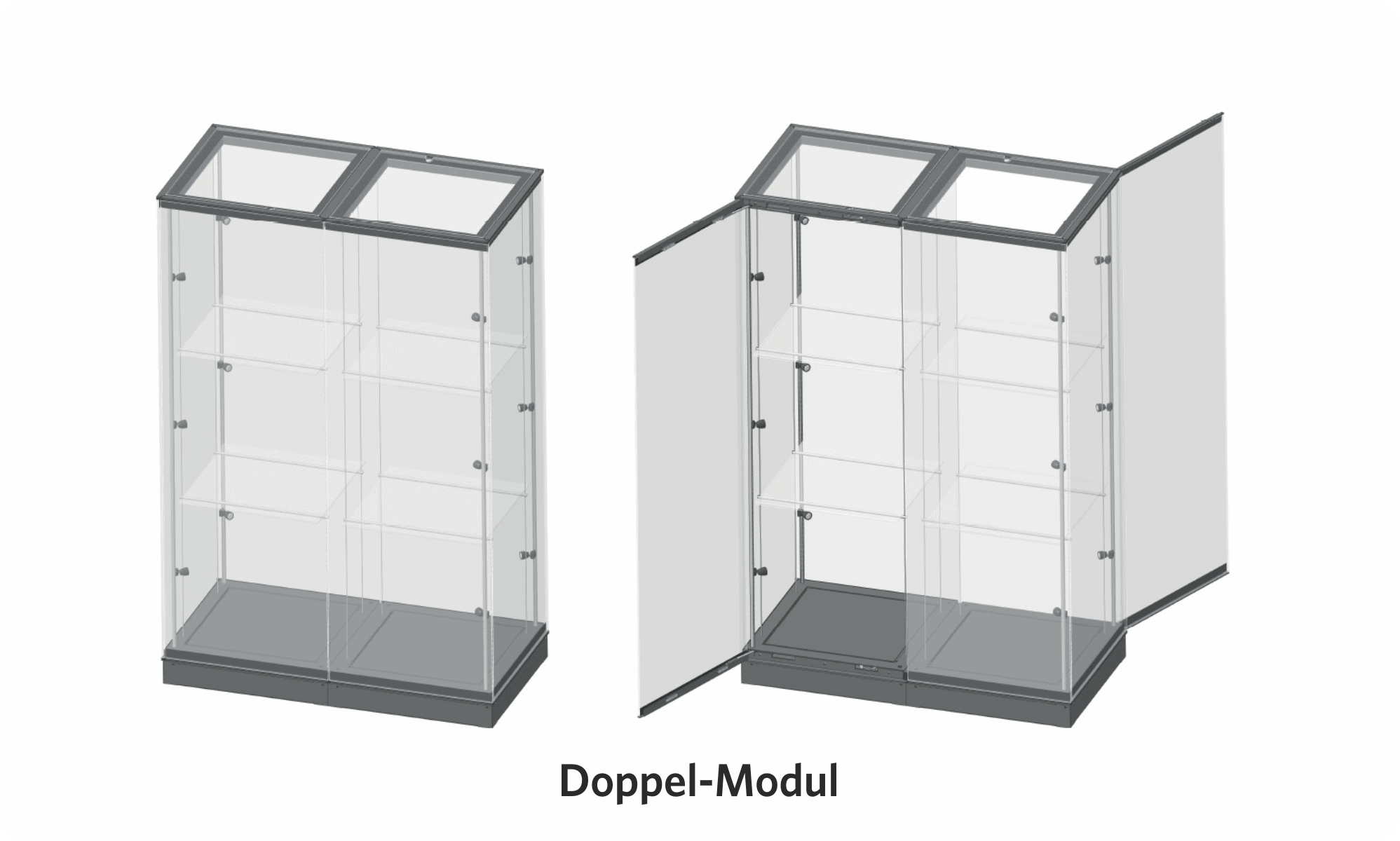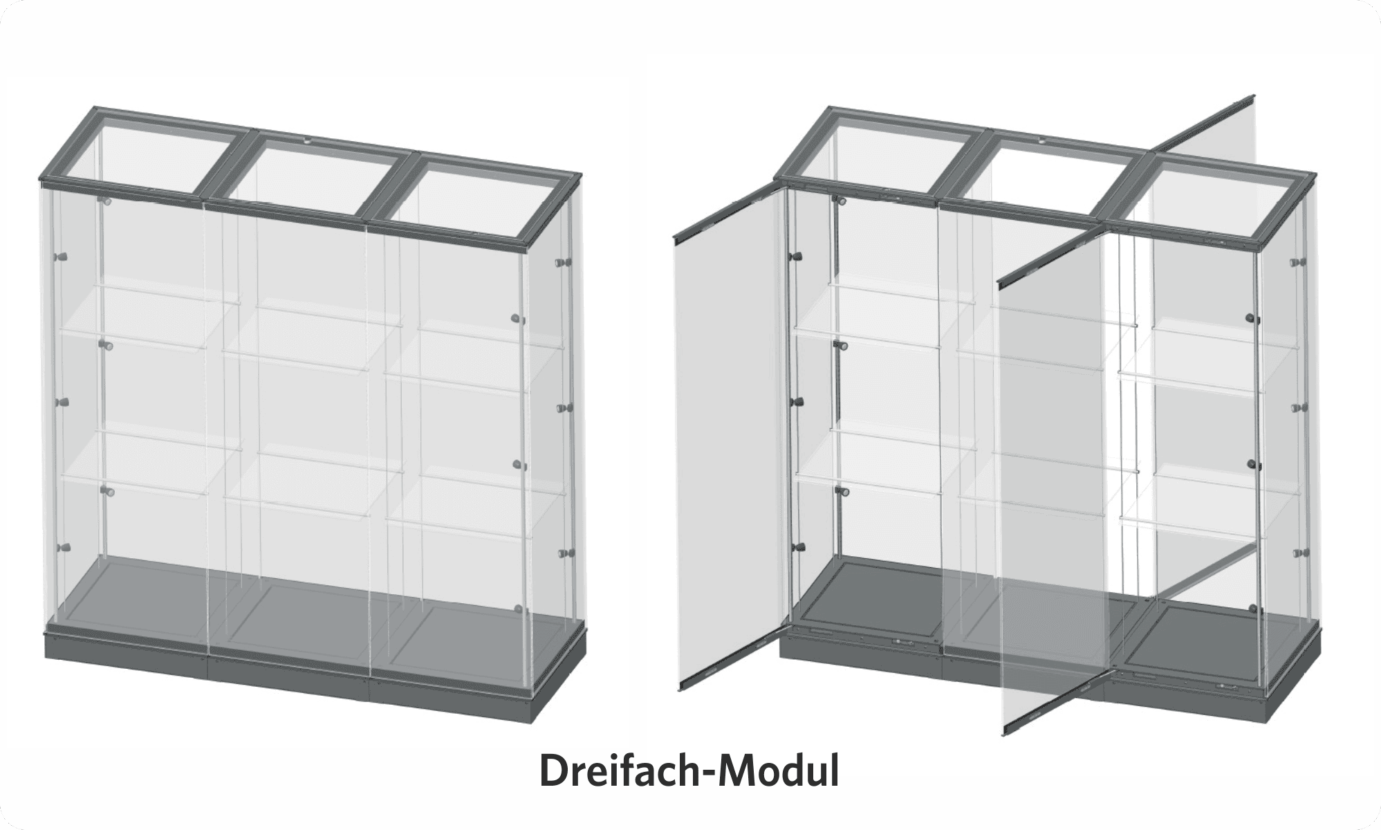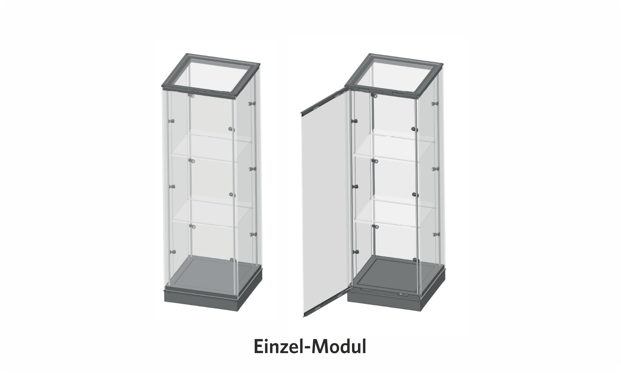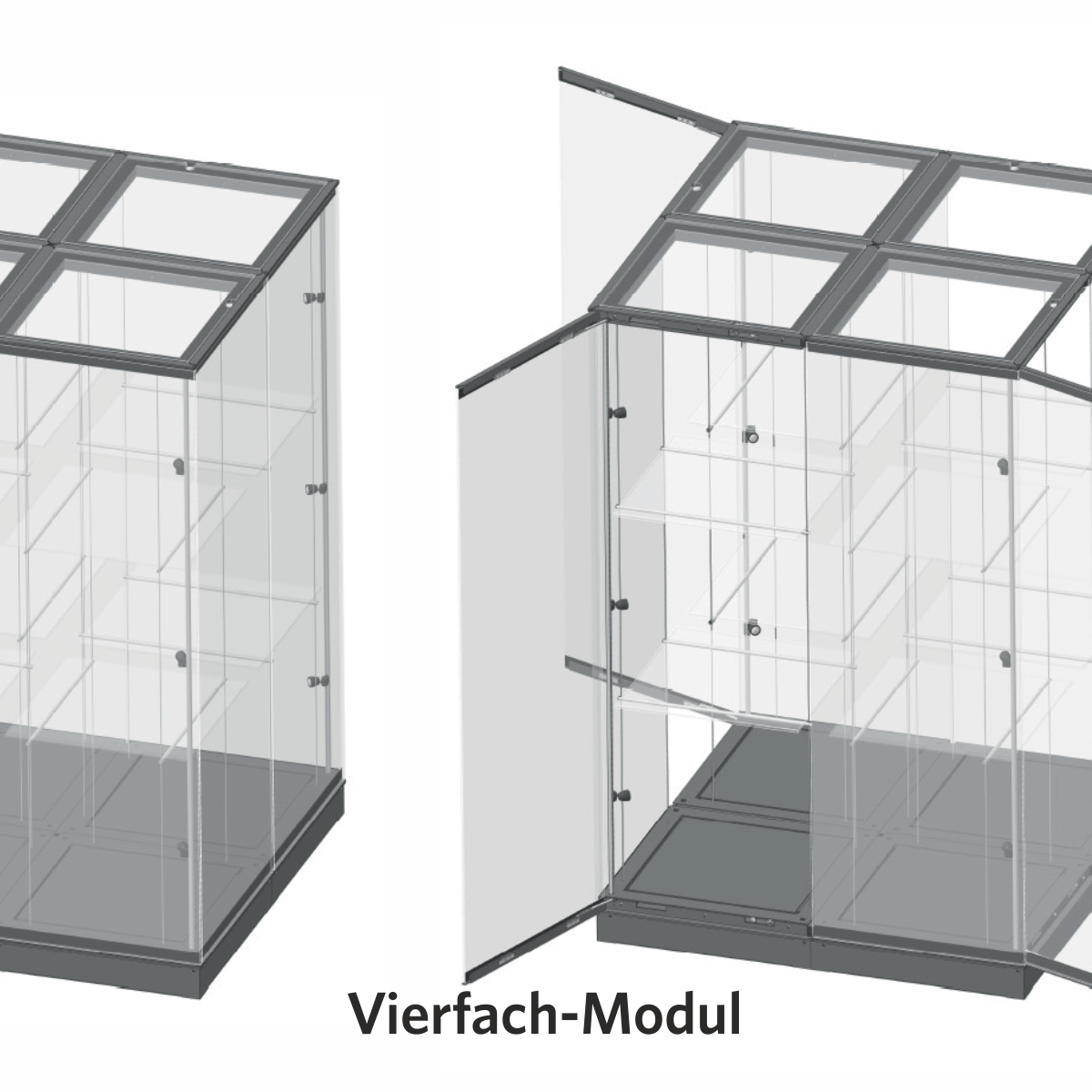 Das modulare Vitrinensystem ermöglicht die Realisierung komplexer Vitrinen in unterschiedlichsten Formen, aufgebaut aus mehreren Modulen. Jedes Modul kann unabhängig voneinander mit integrierter Beleuchtung und Einlegeböden ausgestattet werden.
