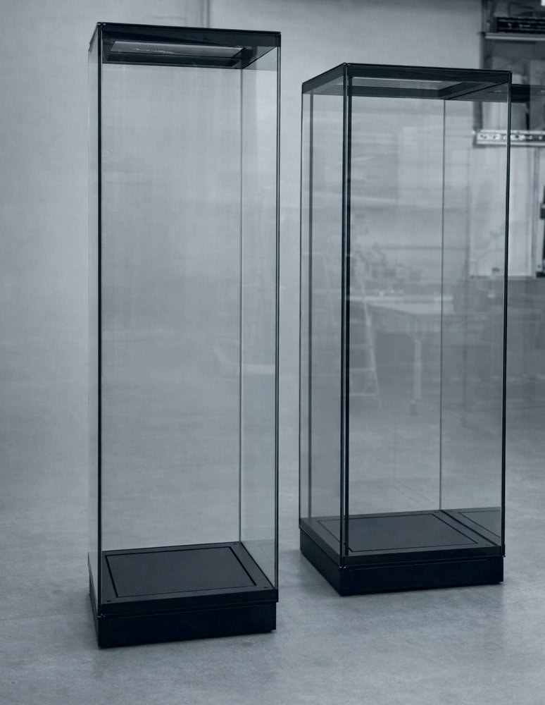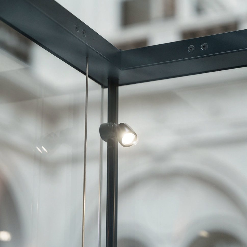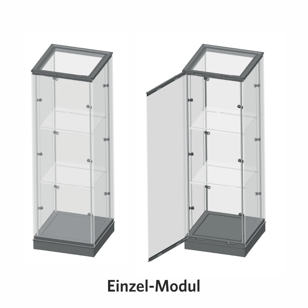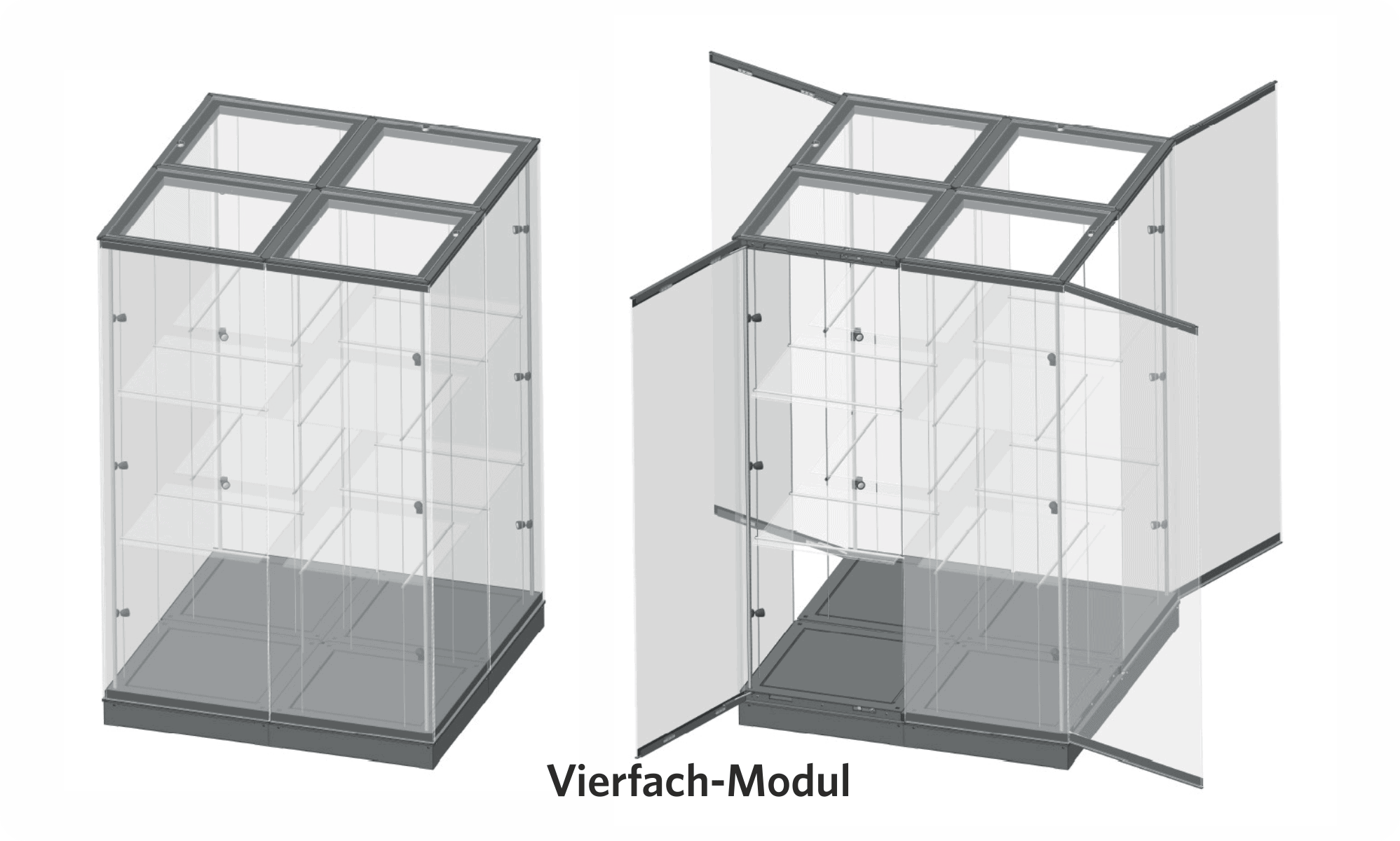 Das modulare Vitrinensystem ermöglicht die Realisierung komplexer Vitrinen in unterschiedlichsten Formen, aufgebaut aus mehreren Modulen. Jedes Modul kann unabhängig voneinander mit integrierter Beleuchtung und Einlegeböden ausgestattet werden.