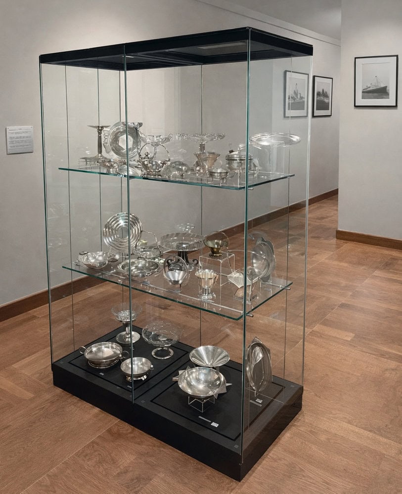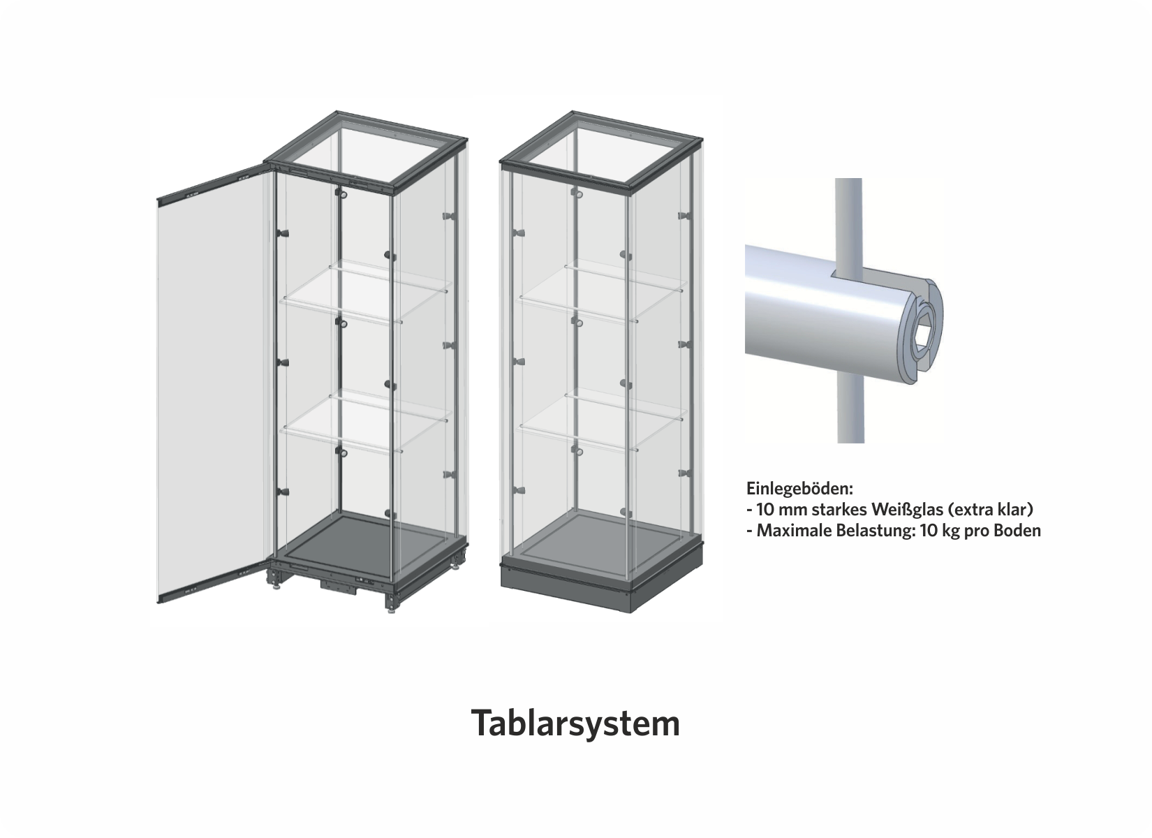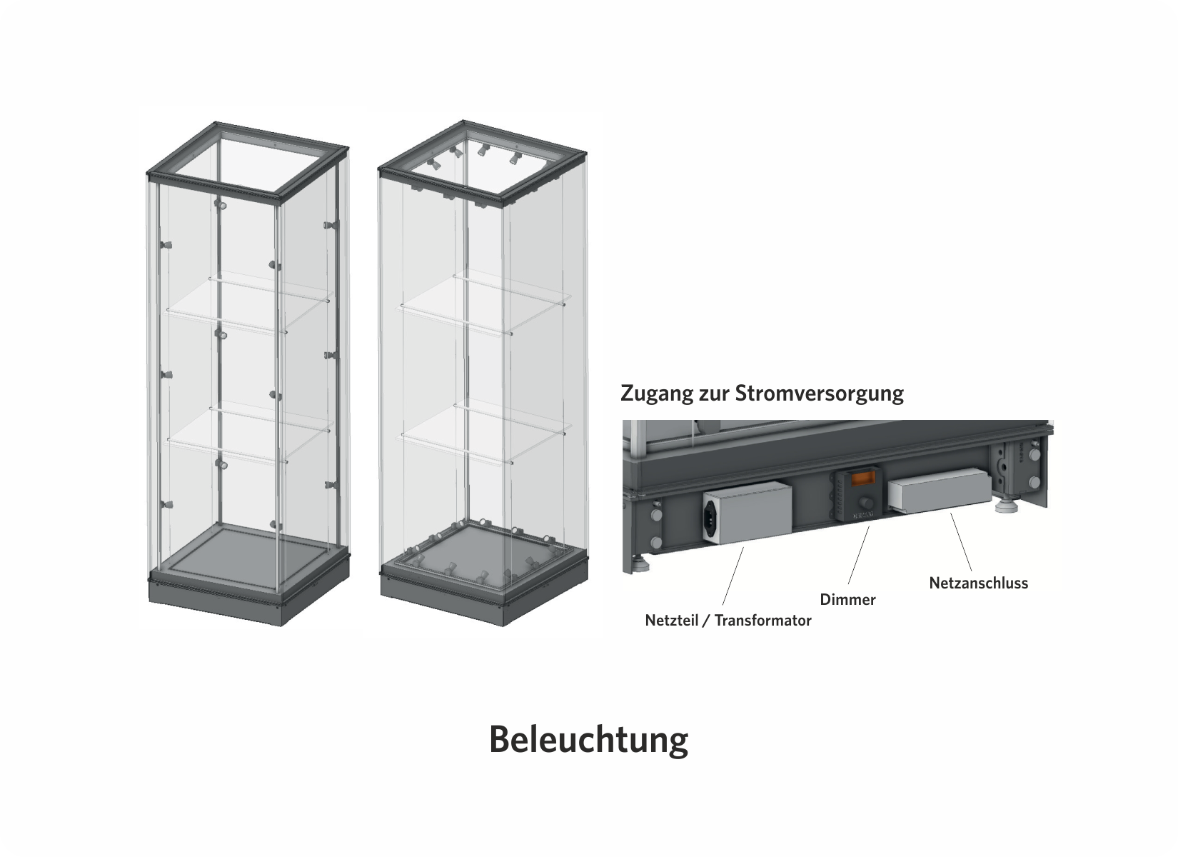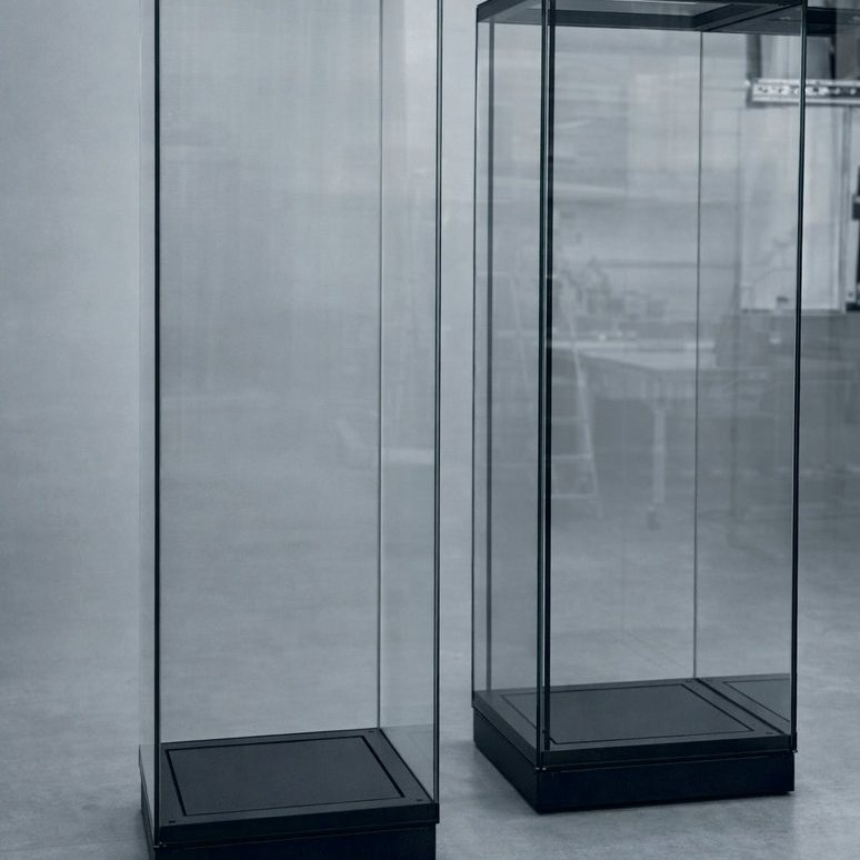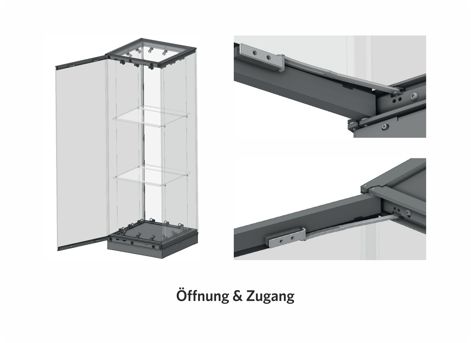 Das modulare Vitrinensystem ermöglicht die Realisierung komplexer Vitrinen in unterschiedlichsten Formen, aufgebaut aus mehreren Modulen. Jedes Modul kann unabhängig voneinander mit integrierter Beleuchtung und Einlegeböden ausgestattet werden.