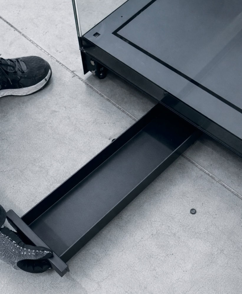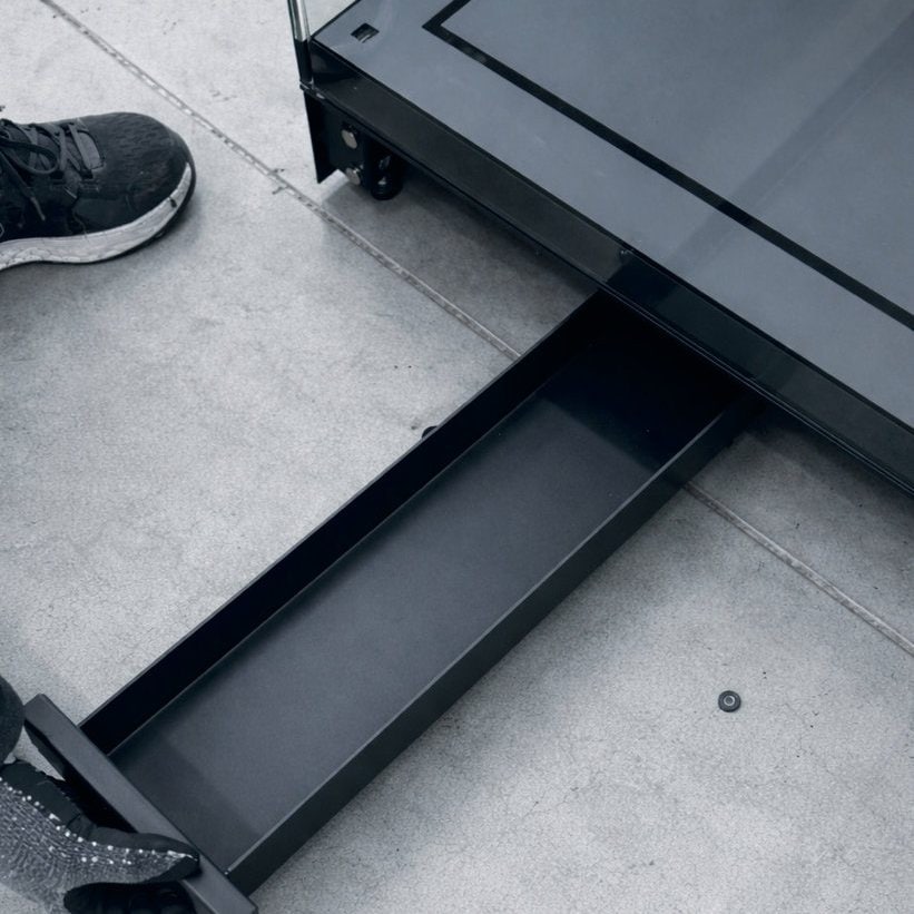 Das Tablarsystem kann mit zwei Glasböden ausgestattet werden. Das System besteht aus gespannten Edelstahlseilen, die mit Klemmen versehen sind, um ein seitliches Schwingen zu verhindern.