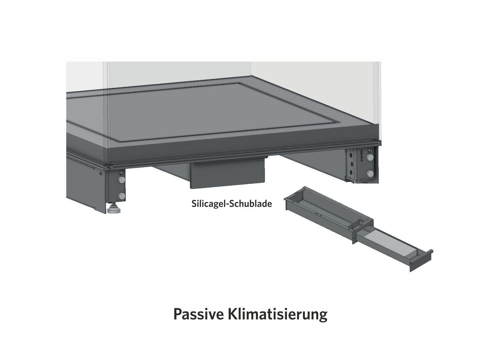 Passive Klimatisierung mittels Trockenmittel-Einheit (Kapazität: 2 Prosorb®-Kassetten), untergebracht in einem separaten Sockelfach mit eigenem Zugang über ein abnehmbares Paneel (AER: 0,1/Tag).